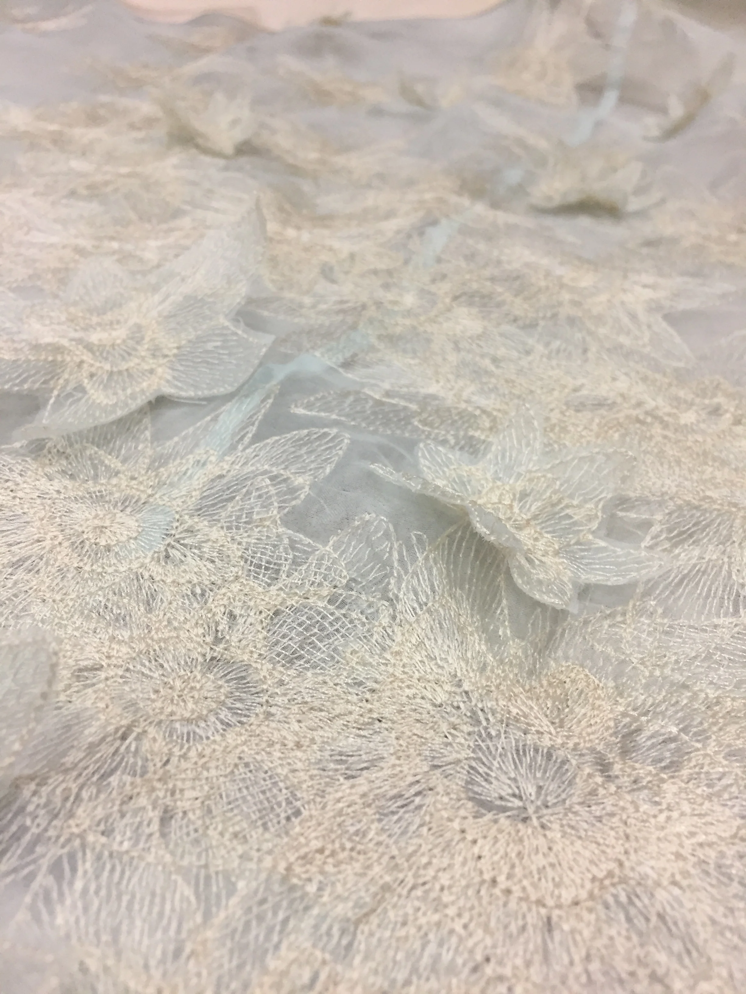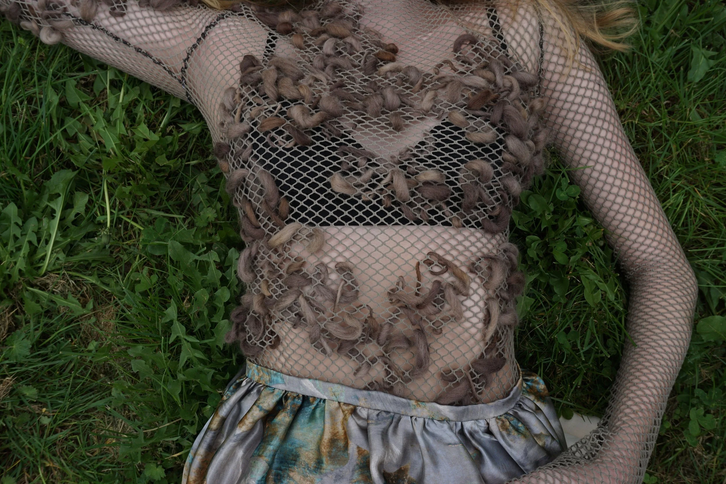 Hand Embroidered Raw Wool on Mesh Fabric.